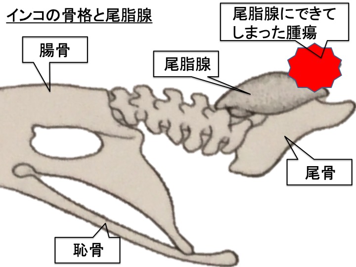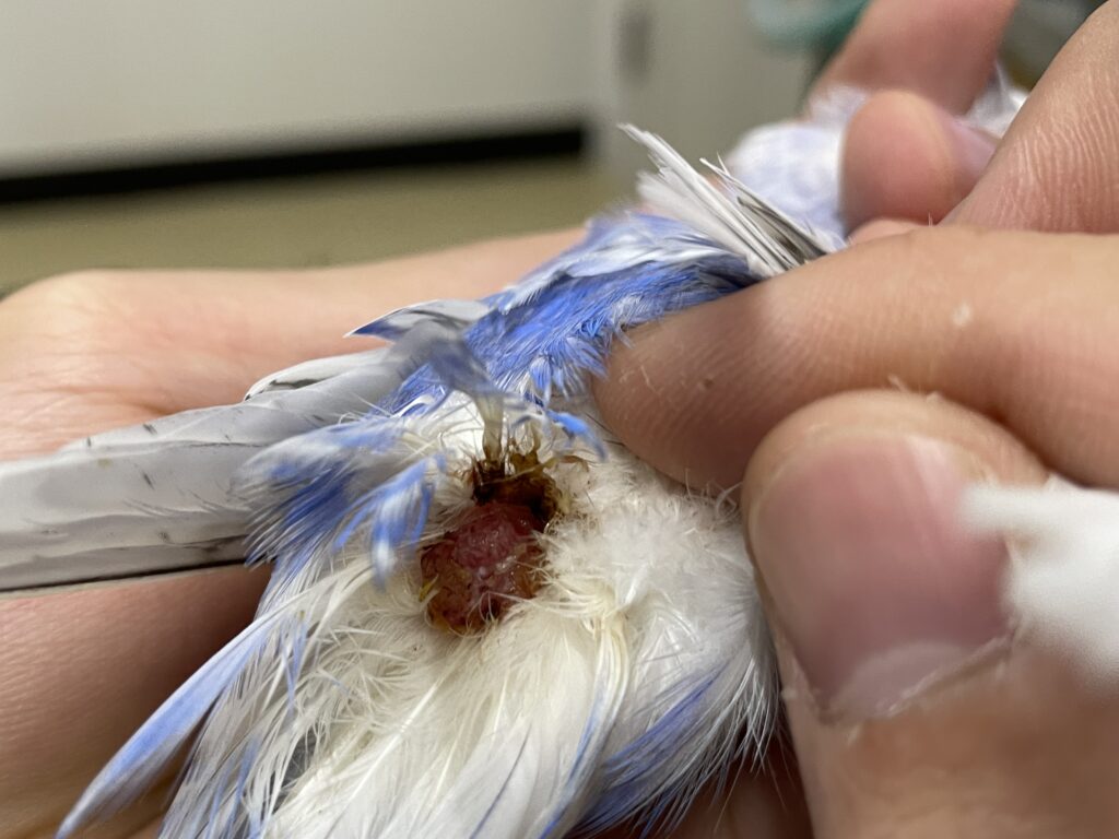 さて、そんな尾脂腺が腫瘍化(がんになる)することがあります。尾脂腺腫瘍は発生初期は気にならないことが多いですが、大きくなると痛痒いため、違和感を感じて嘴でつついてしまい出血してしまうことがあります。
