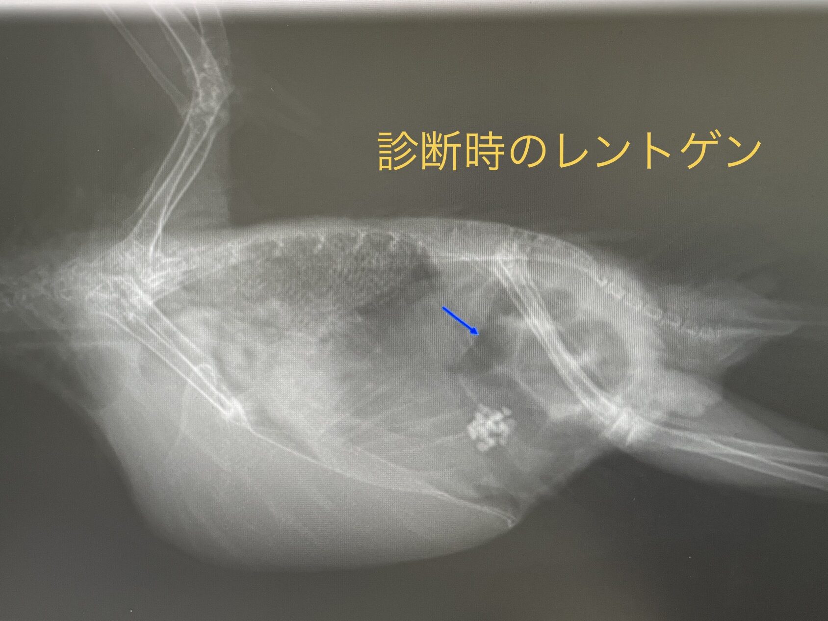 きび詰まり 投稿日 2023年9月9日 更新日 2023年12月19日 著者 munatex カテゴリー 消化器疾患 カテゴリー 症例集 キビは他のシードよりも硬くて大きいため、胃腸が弱い子では筋胃ですり潰されず腸で詰まってしまうことがあります。こちらは急に便が出なくなってしまったセキセイインコのレントゲン検査画像です。腸の蠕動運動がほとんど停止してしまい、消化管内にガス貯留(青矢印)が認められます。胃腸機能改善の入院治療により便は出るようになり、その後消化管機能は回復しました。
